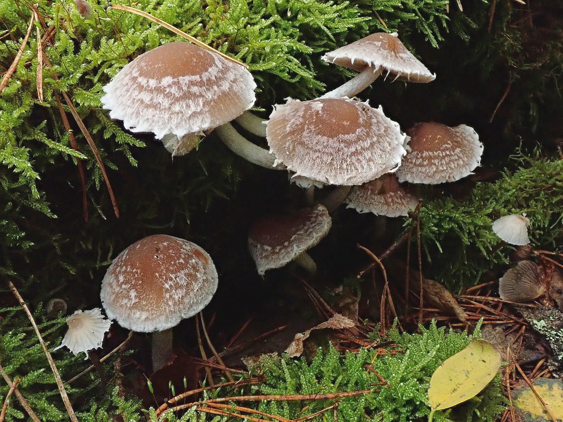 Insgesamt 56 Helmlinge sind bisher mit einem Porträt im Fundkorb vertreten. Die allermeisten von ihnen wachsen an Holz. Drei Arten verdienen aufgrund ihrer Seltenheit und Substratwahl Beachtung. Mycena filopes wächst in Augenhöhe auf Fichtenzweigen, Mycena strobilicola auf Fichtenzapfen, und die in Mitteleuropa extrem seltene Mycena seynii auf Kiefernzapfen.