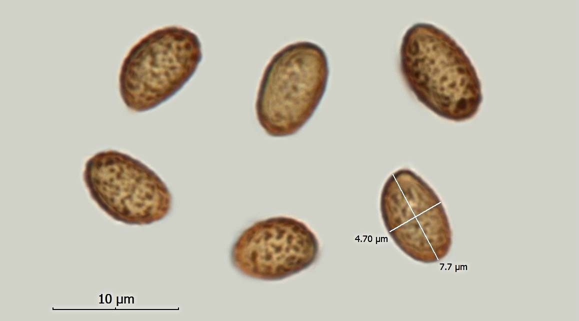 Sporen: ellipsoid bis mandelförmig, grob und niedrig warzig; 7 – 8,3 x 4,3 – 5 µm, Schlankheitsgrad Q = 1,60 – 1,67, Volumen 83 – 90 µm³ (29 Sporen gemessen).