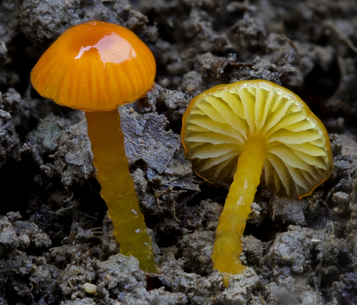 Hygrocybe glutinipes ist einer der kleinsten und schleimigsten Saftlinge, wobei sowohl Hut als auch Stiel mit einer Schleimschicht überzogen sind. Im Alter oder bei längerer Trockenheit ist jedoch auch er eher fettig oder klebrig, weshalb er auch Klebriger Saftling genannt wird. Die Farbskala reicht von kräftig orange bis ocker- oder zitronengelb. Bei diversen Auroren findet man auch Farbangaben wie löwen- bis orangegelb oder granatrot. Diese Variabilität deutet schon an, wie schwierig es ist, Saftlinge sicher zu bestimmen, zumal auch noch die mikroskopischen Merkmale sehr unterschiedlich sein können.