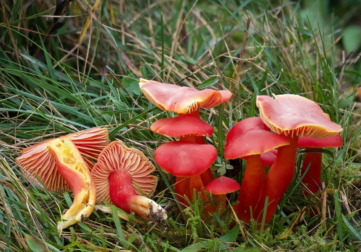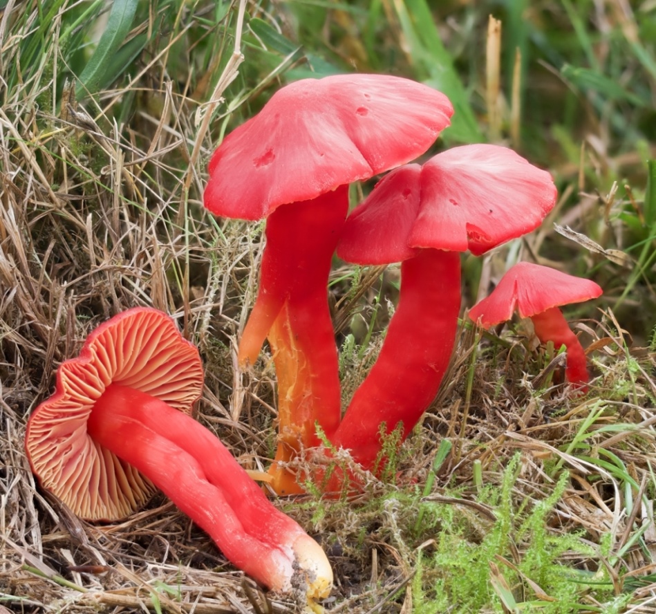 Hygrocybe coccinea = Kirschroter Saftling: kleinere Fruchtkörper (8 – 11 x 5 – 6 µm) mit ebenfalls klebriger bis schmieriger Hutoberfläche