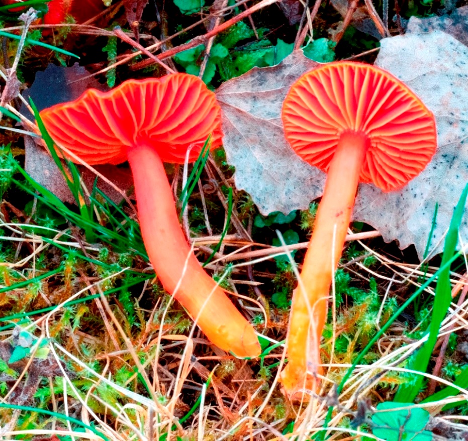 Hygrocybe reidii = Honigsaftling: Hut deutlich kleiner (1 – 3 cm), Farbe meist heller (orange)