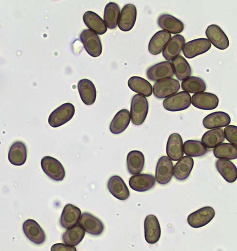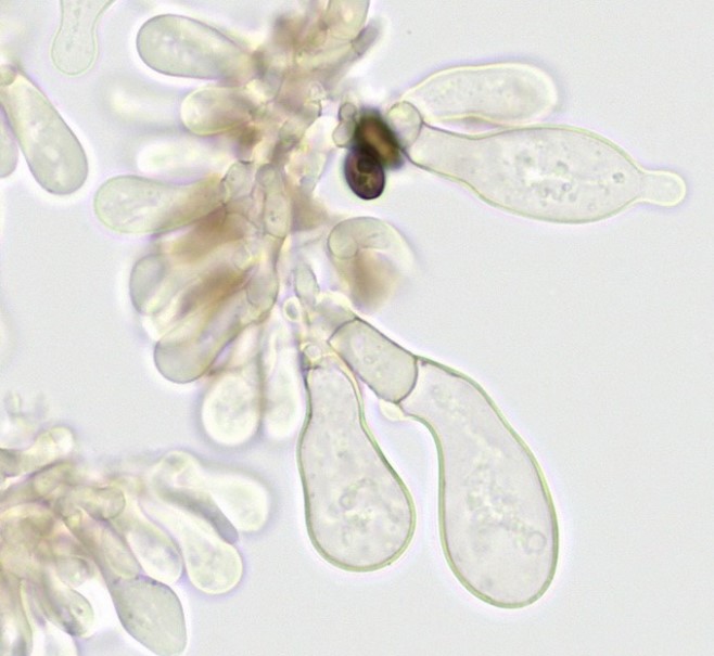 Sporen elliptisch bis bohnenförmig, mit Keimporus, 6 – 9 x 3,5 – 5 µm. Basidien schlank, mit Schnallen. Pleurozystiden dünnwandig, flaschenförmig, an der Spitze kopfig erweitert. Cheilozystiden: stets von zahlreichen großen Parazystiden durchsetzt, flaschenförmig.