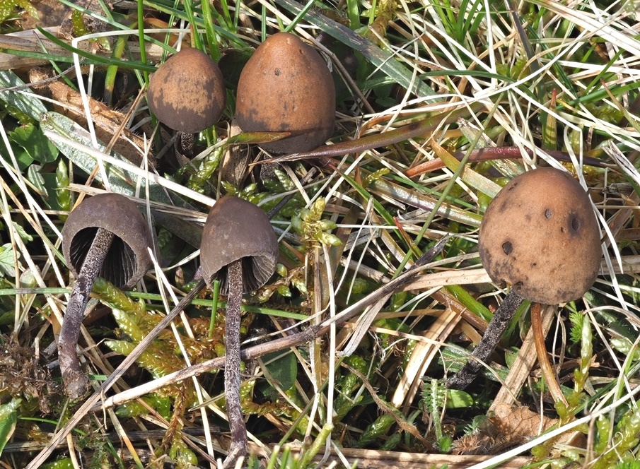 Eine weitere, aber deutlich seltenere Art ist der makroskopisch leicht bestimmbare Ring-Düngerling Panaeolus semiovatus. Sein Alleinstellungsmerkmal ist der häutige Ring am Stiel, der allerdings bis weit in die untere Hälfte verschoben und sehr unauffällig sein kann. Er ensteht, wenn das Velum partiale beim Aufschirmen des jung noch geschlossenen Hutes an dessen Rand abreißt und am Stiel hängen bleibt. Bleibt er jedoch am Hutrand hängen, fehlt er am Stiel. Beim Langstieligen Düngerling Panaeolus acuminatus haben wir es (wie der Name schon besagt) mit einer auffallend langstieligen Art zu tun. Bei Hutgrößen um 1 – 3 cm können sie bis zu 12 cm lang, aber nur 2 – 3 mm dick werden. Außerdem sind sie weißlich bereift. Weißlich bereifte Stiele können auch der Kleinsporige Düngerling Panaeolus reticulatus und der Dunkelrandige Düngerling Panaeolus cinctulus haben.